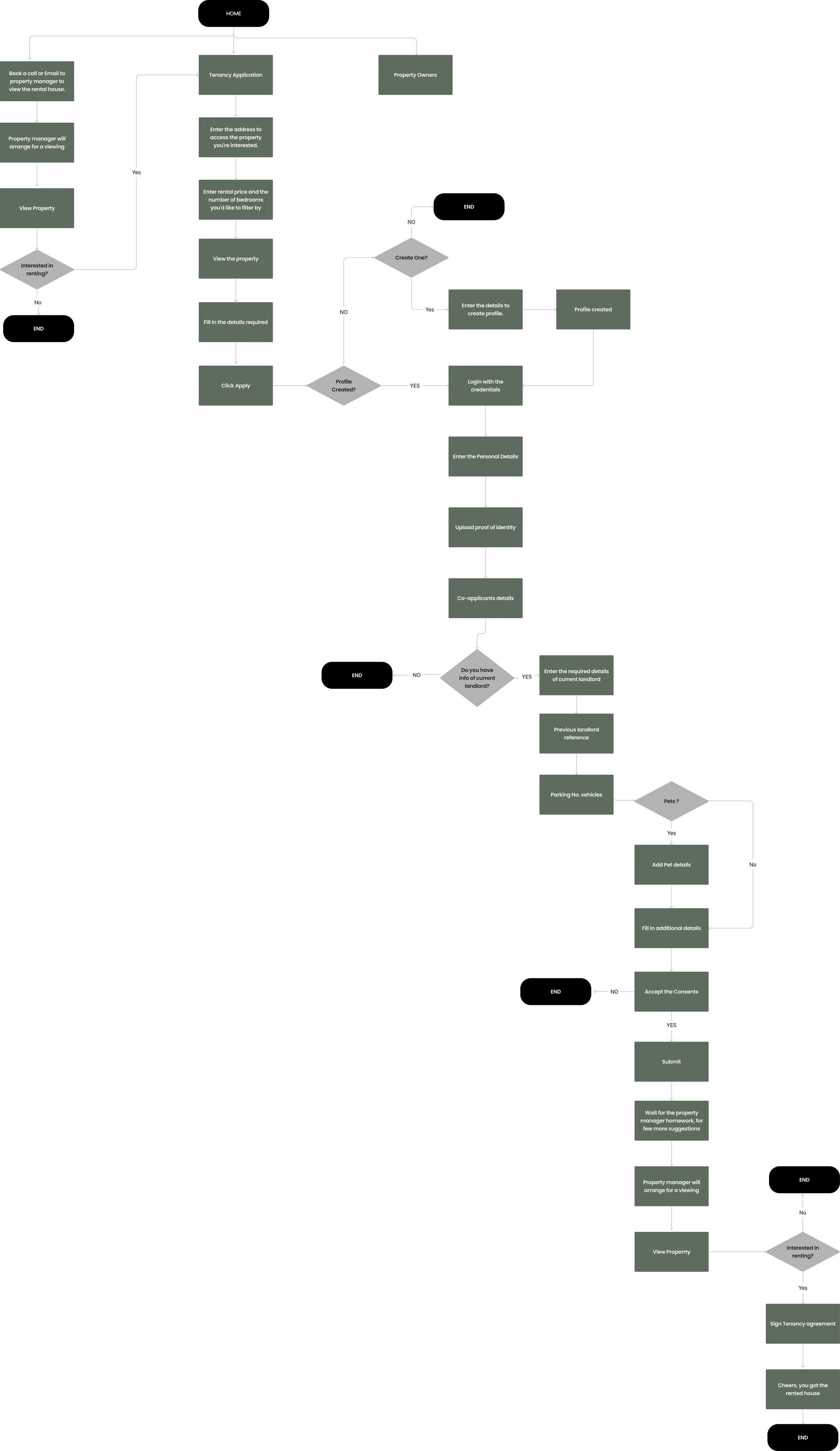 We came up with a new user flow as we progressed through the design process. As an MVP we focused mainly on rental properties and the tenancy agreement application, The proposed user flow follows two main processes: