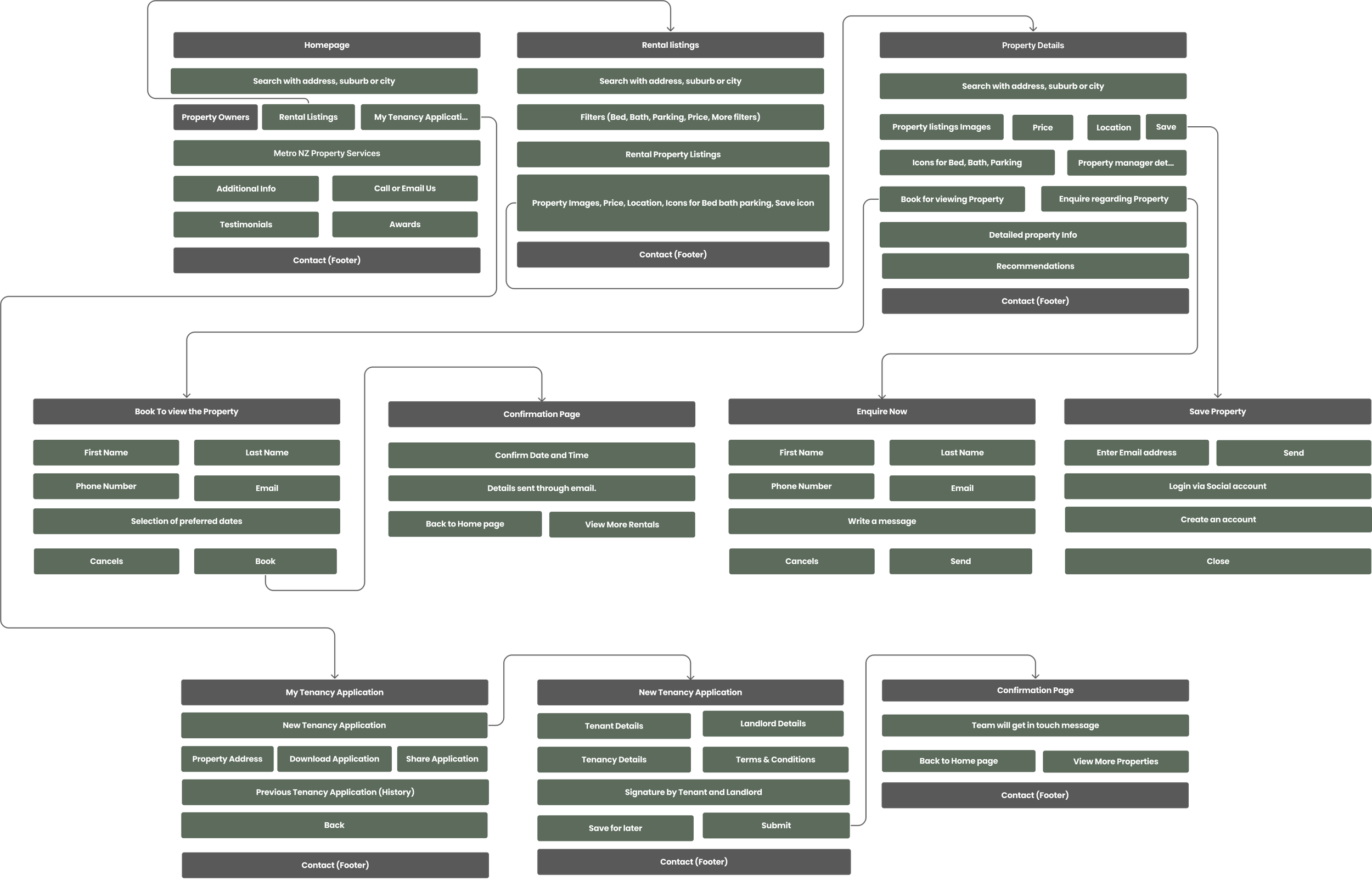 In our effort to redesign the Metro NZ Property page, we developed a suggested information structure to provide collective direction. This structure was created by considering insights gathered from competitor analyses of other rental property websites and by referencing the original user flow.